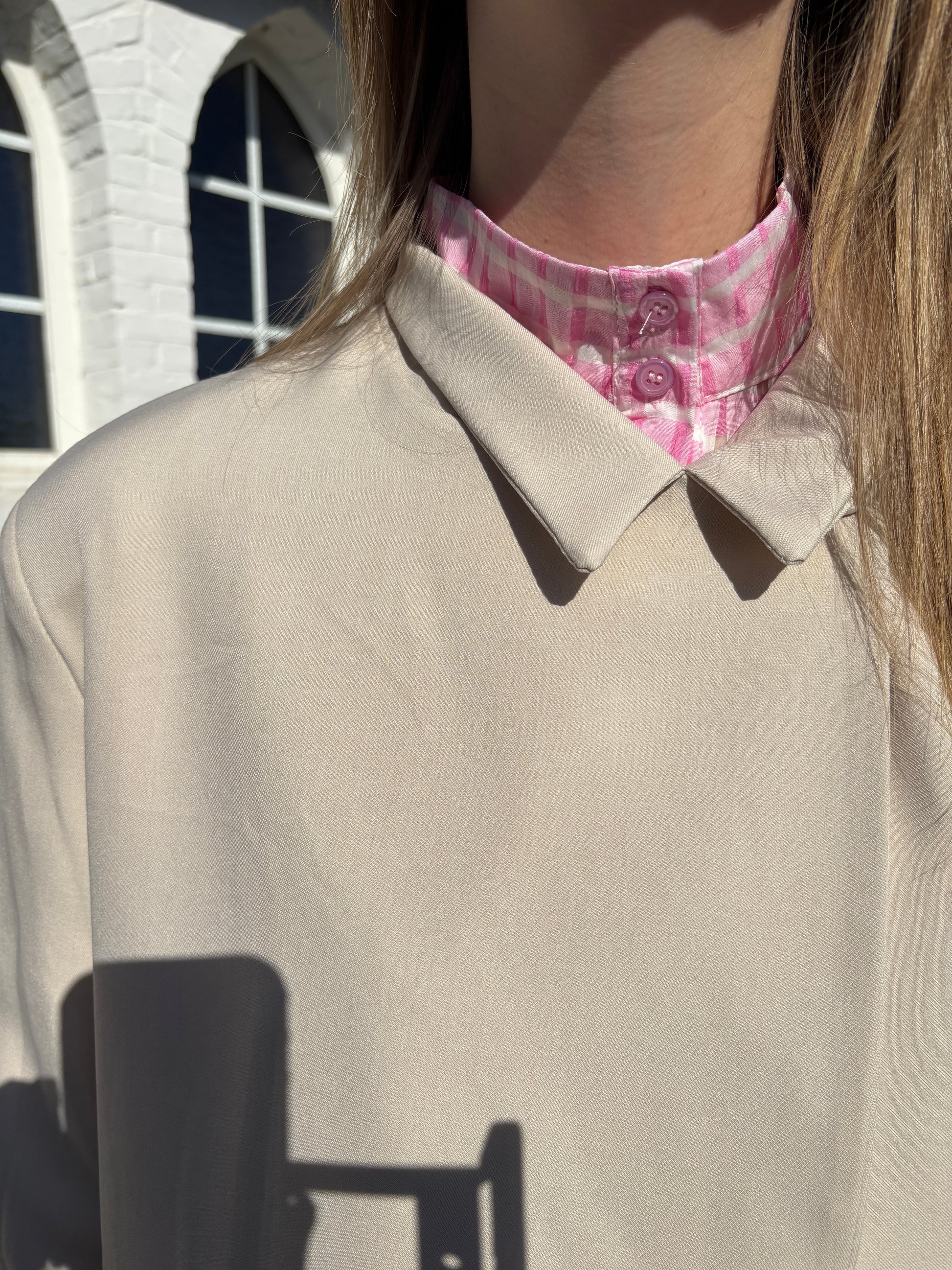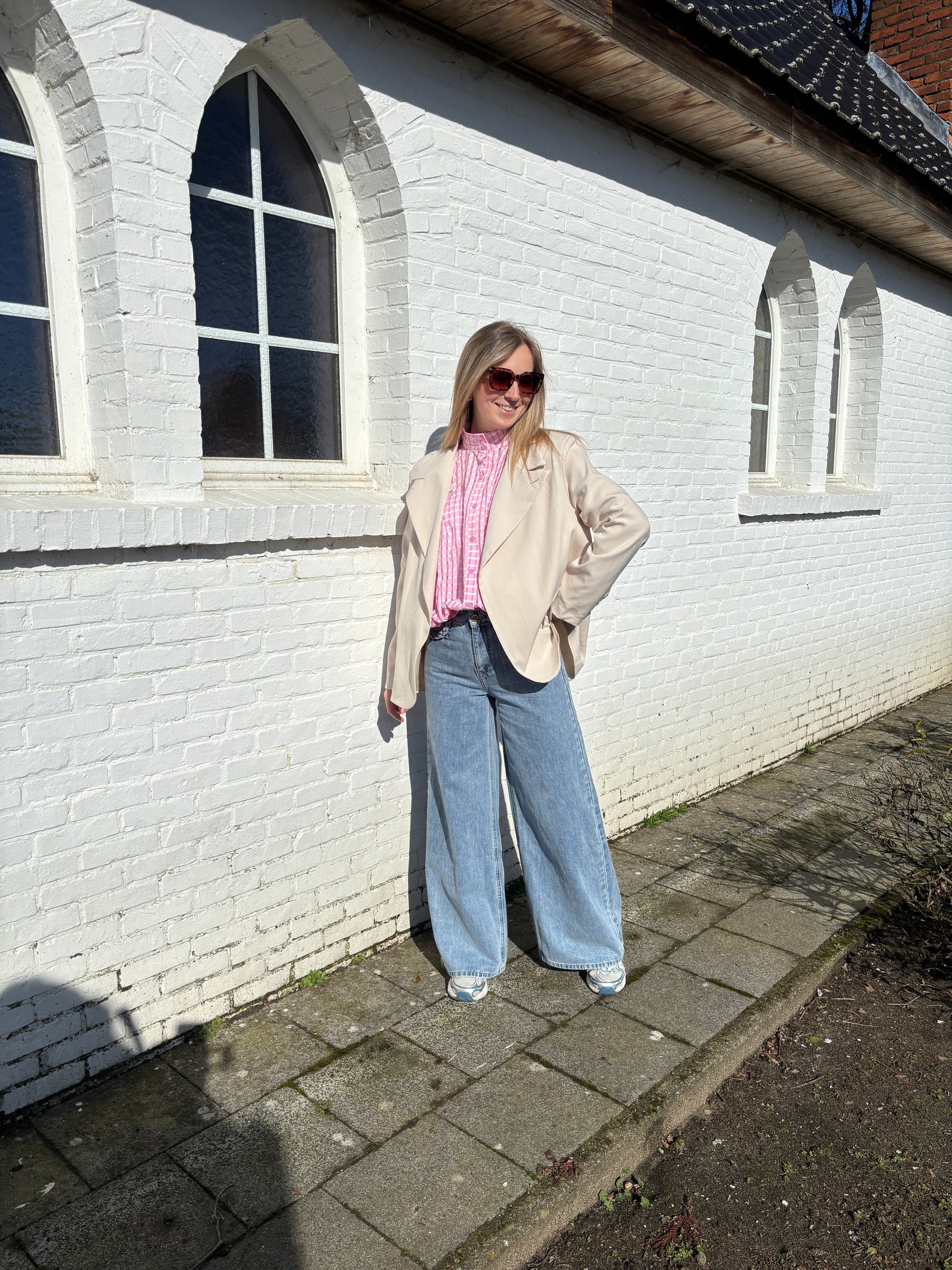 De blazer heeft bovenaan 1 knopje om te sluiten maar je kan hem ook open dragen.