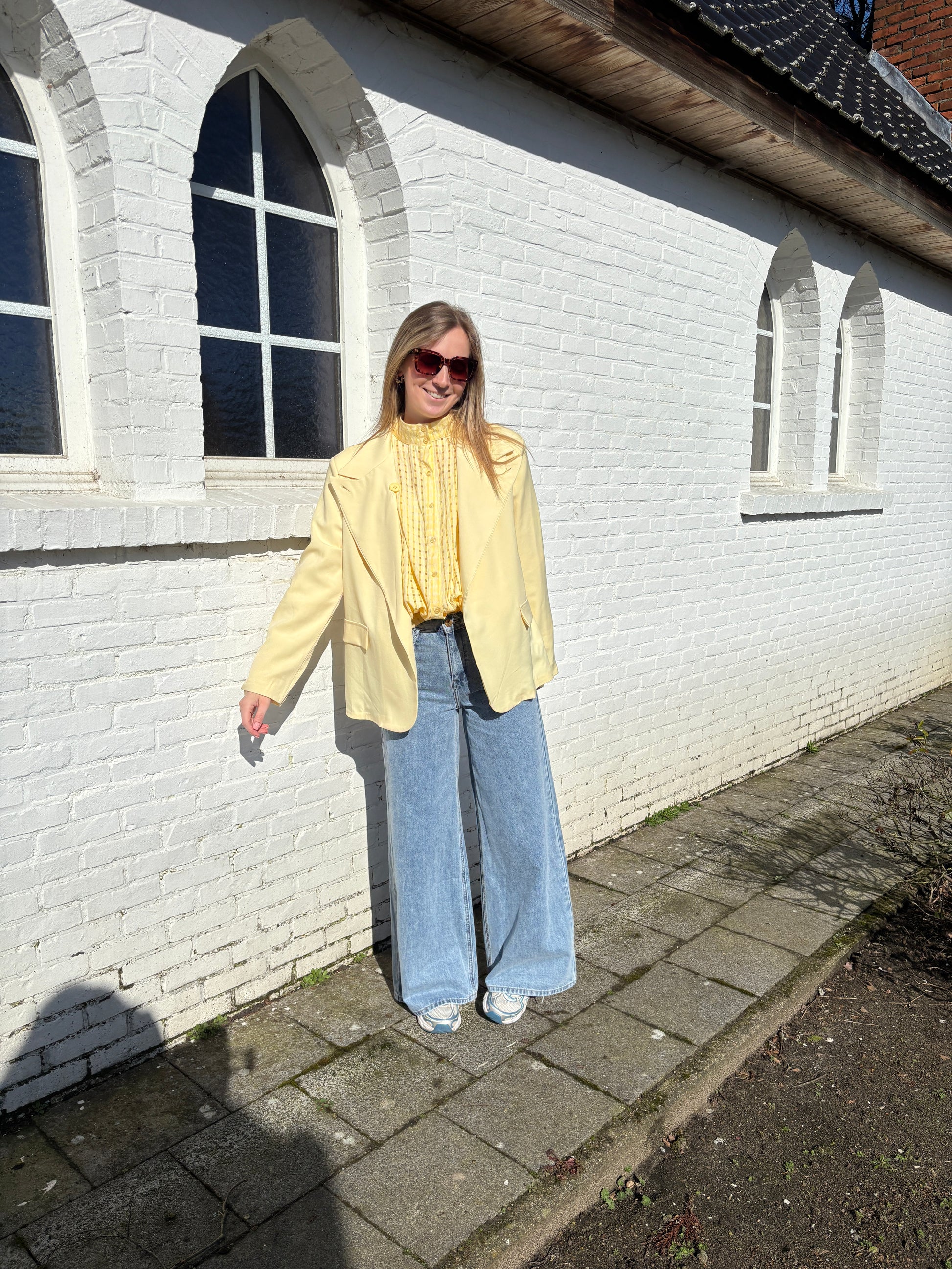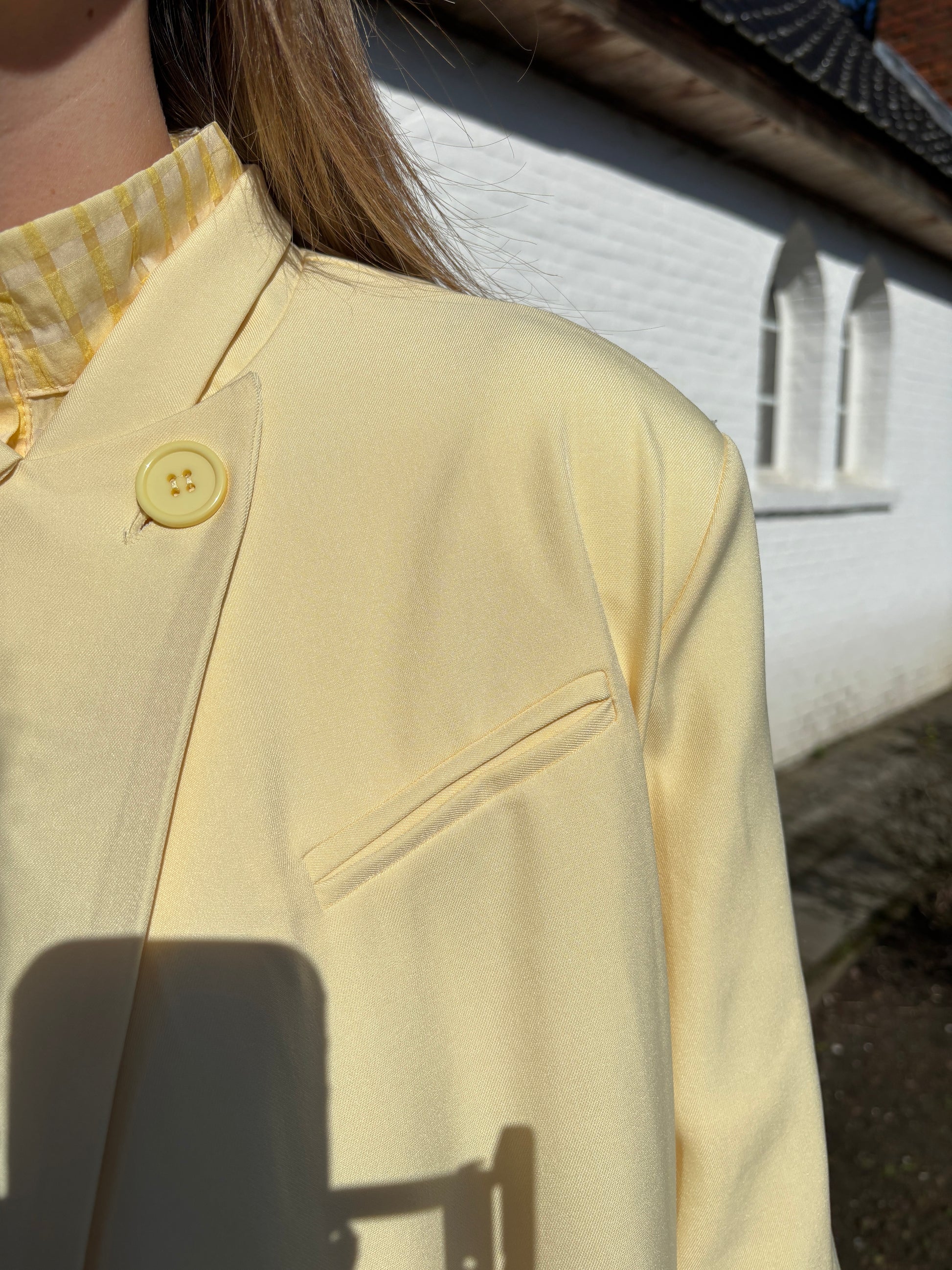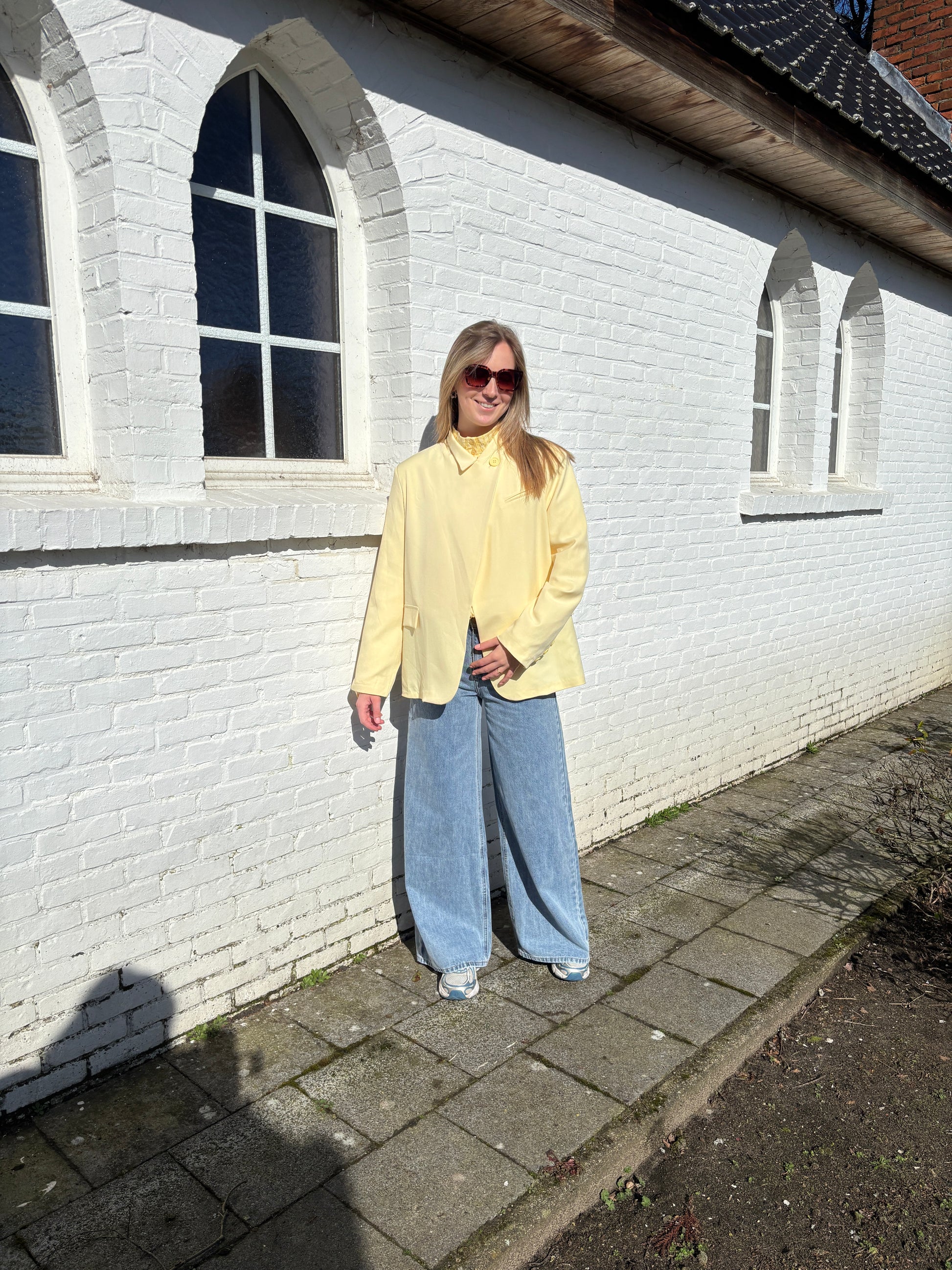 De blazer heeft bovenaan 1 knopje om te sluiten maar je kan hem ook open dragen.