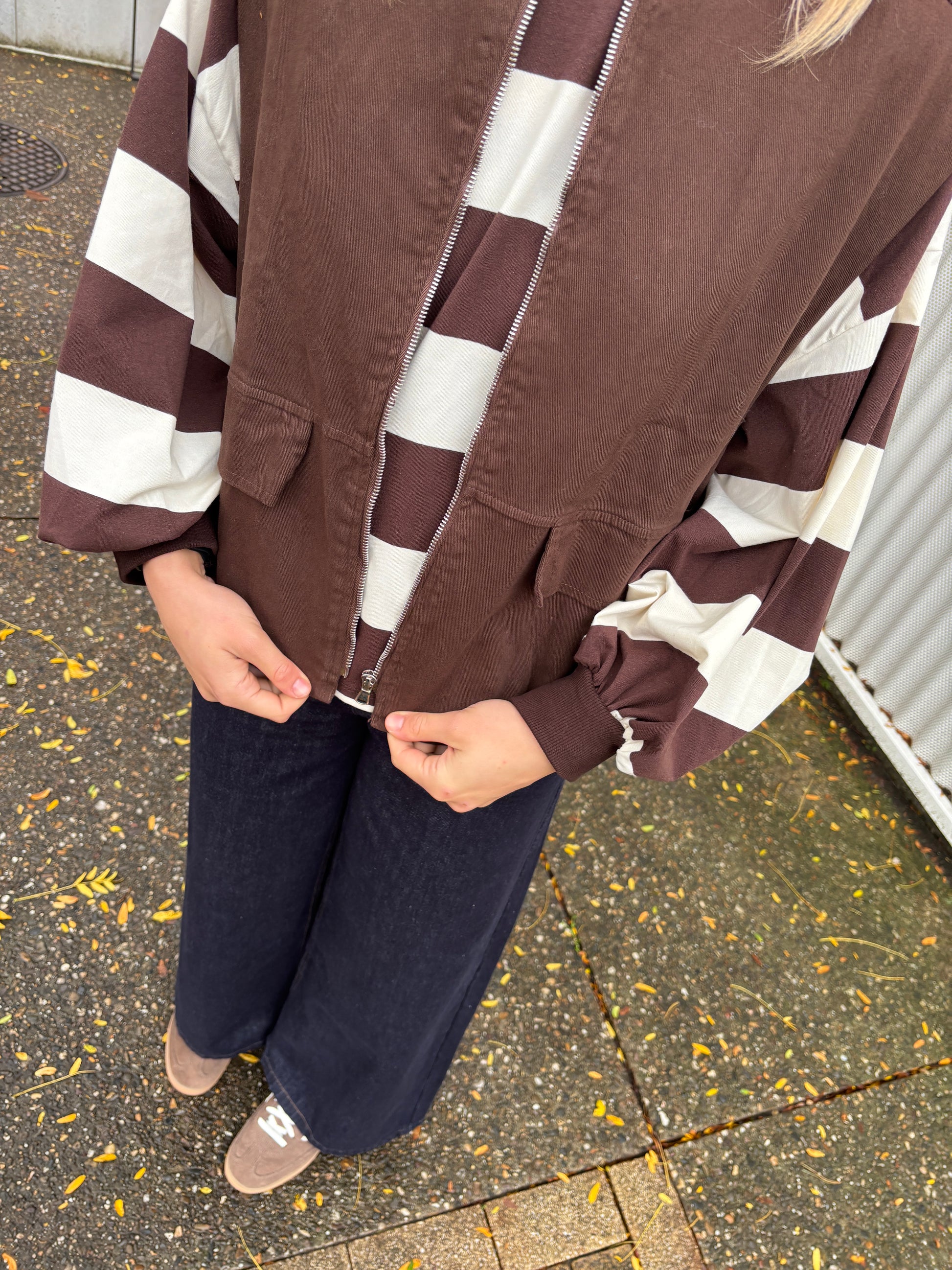 Het jasje heeft een rits en twee neppe zakken.