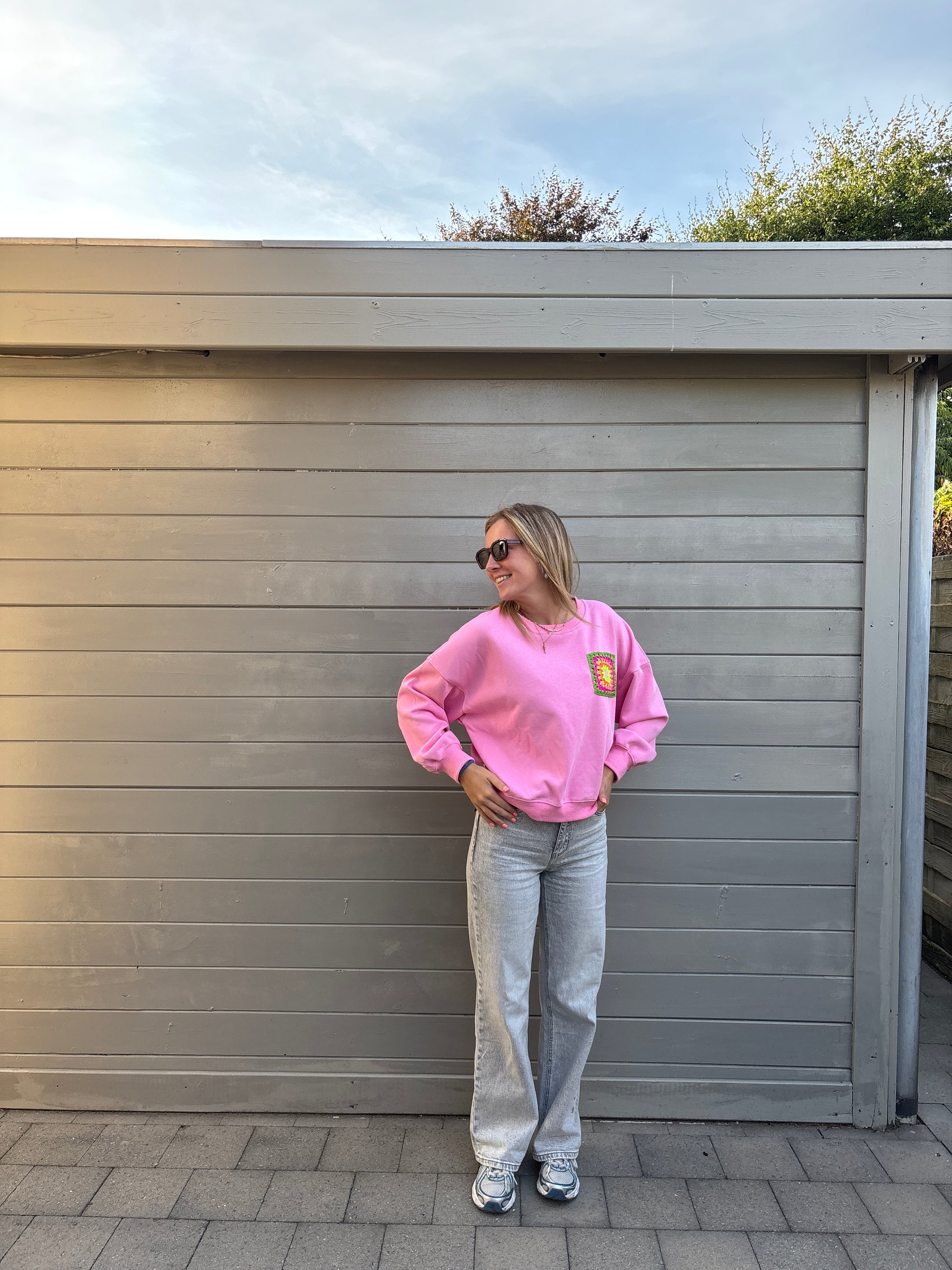 De sweater heeft een crochet-detail op de borst. Let op: dit is geen borstzakje.