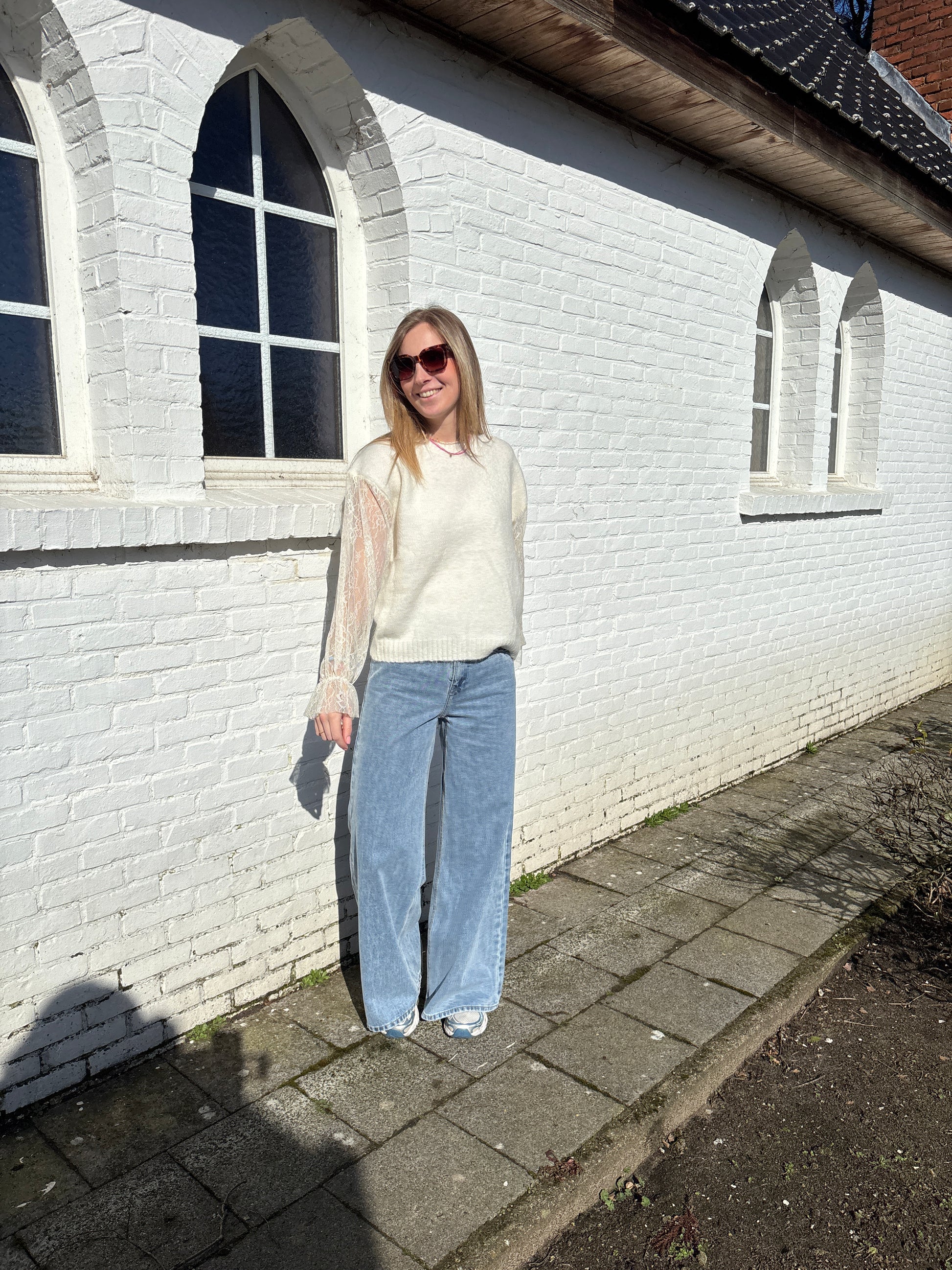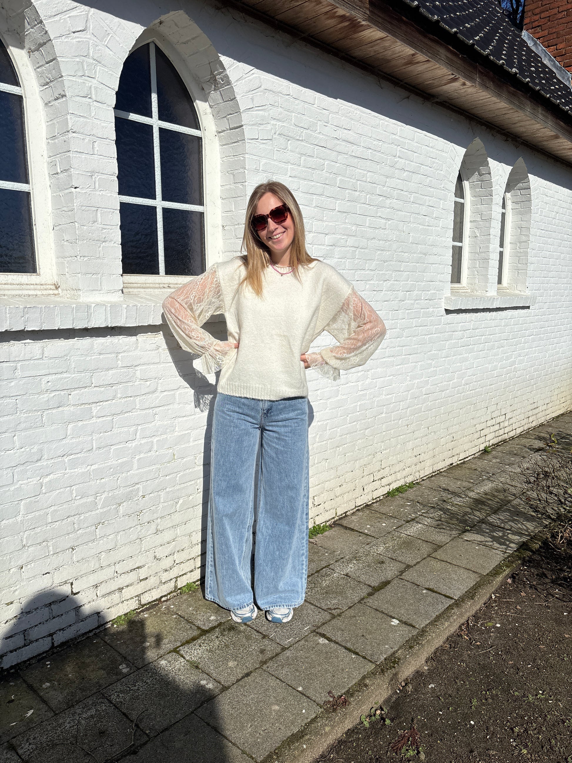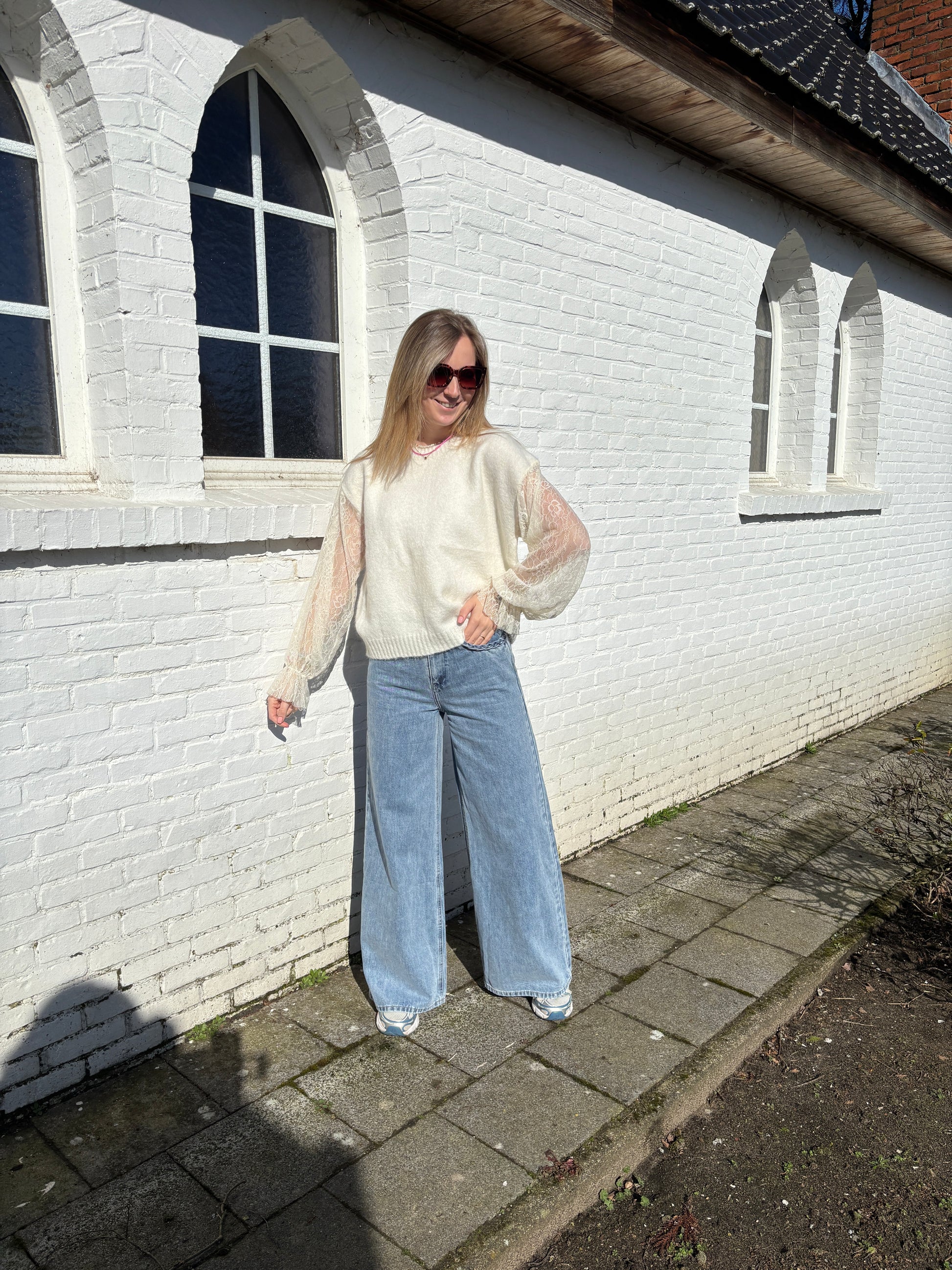 De trui heeft kanten mouwen die eraan vast hangen.