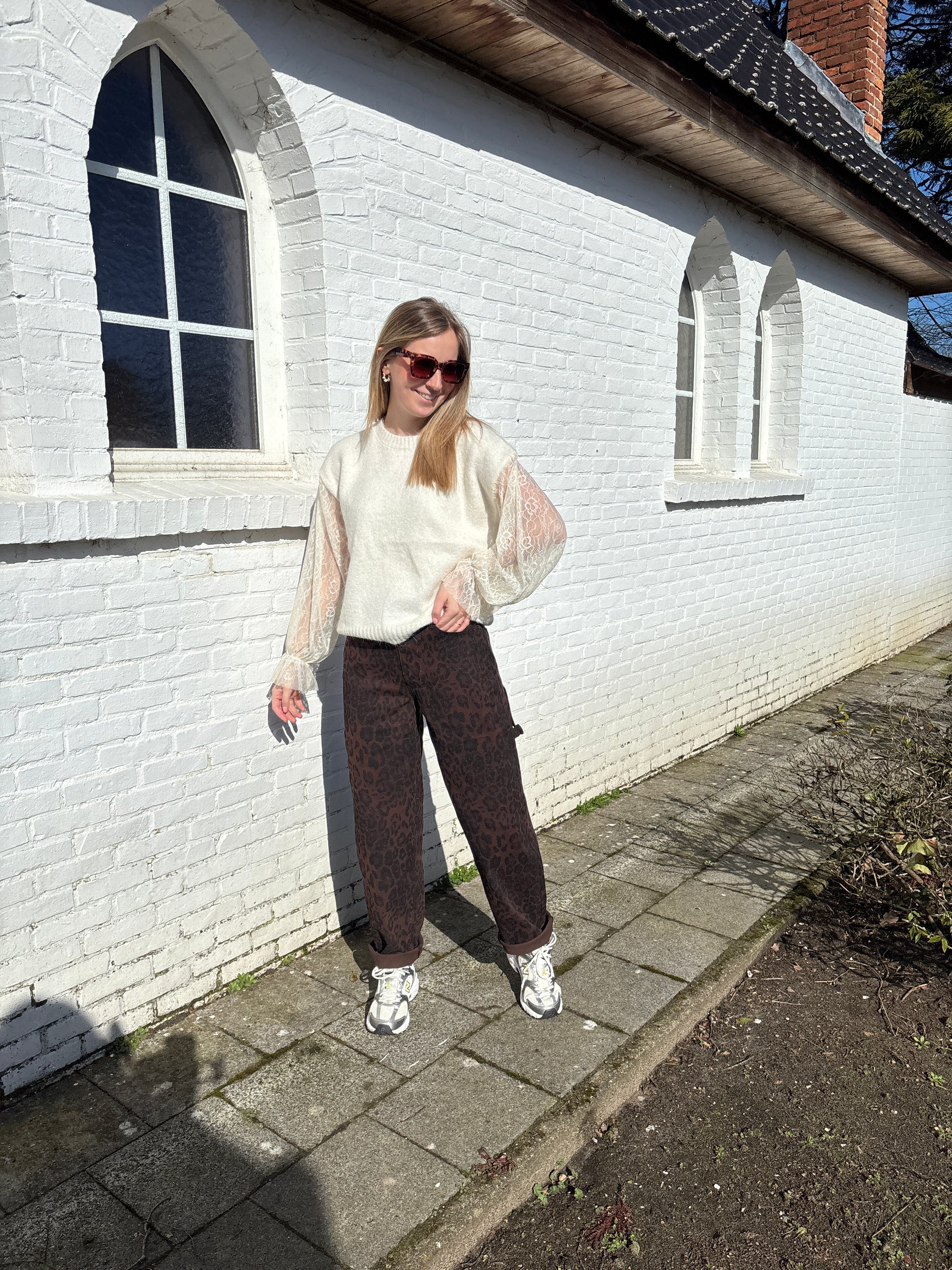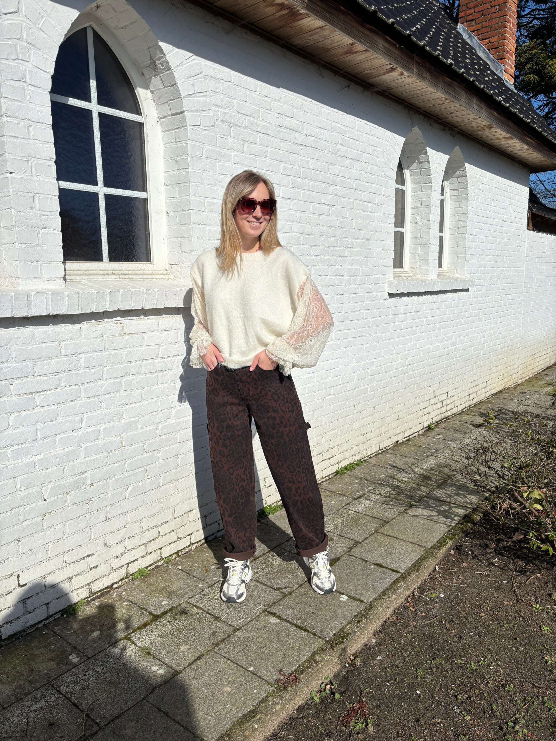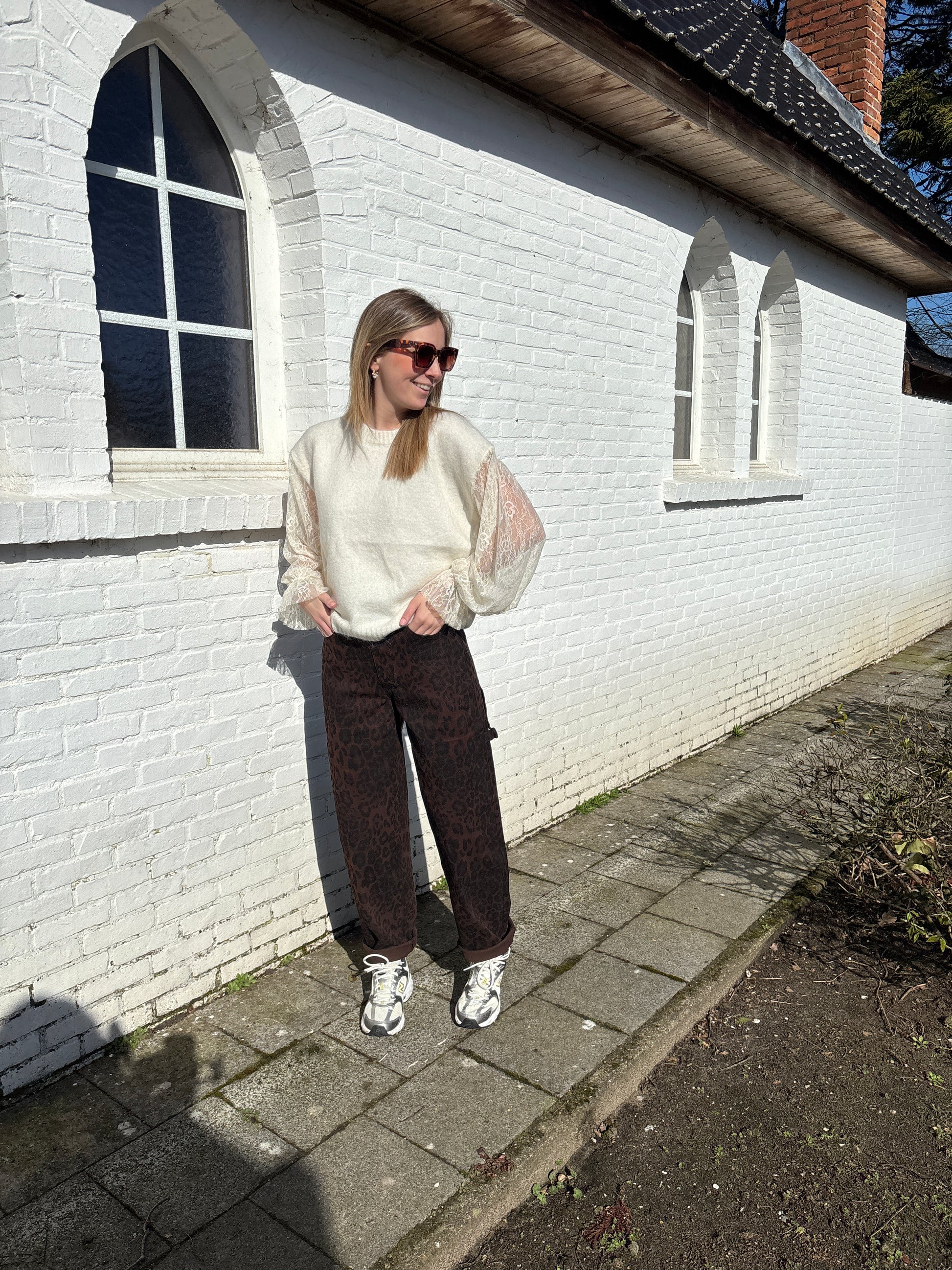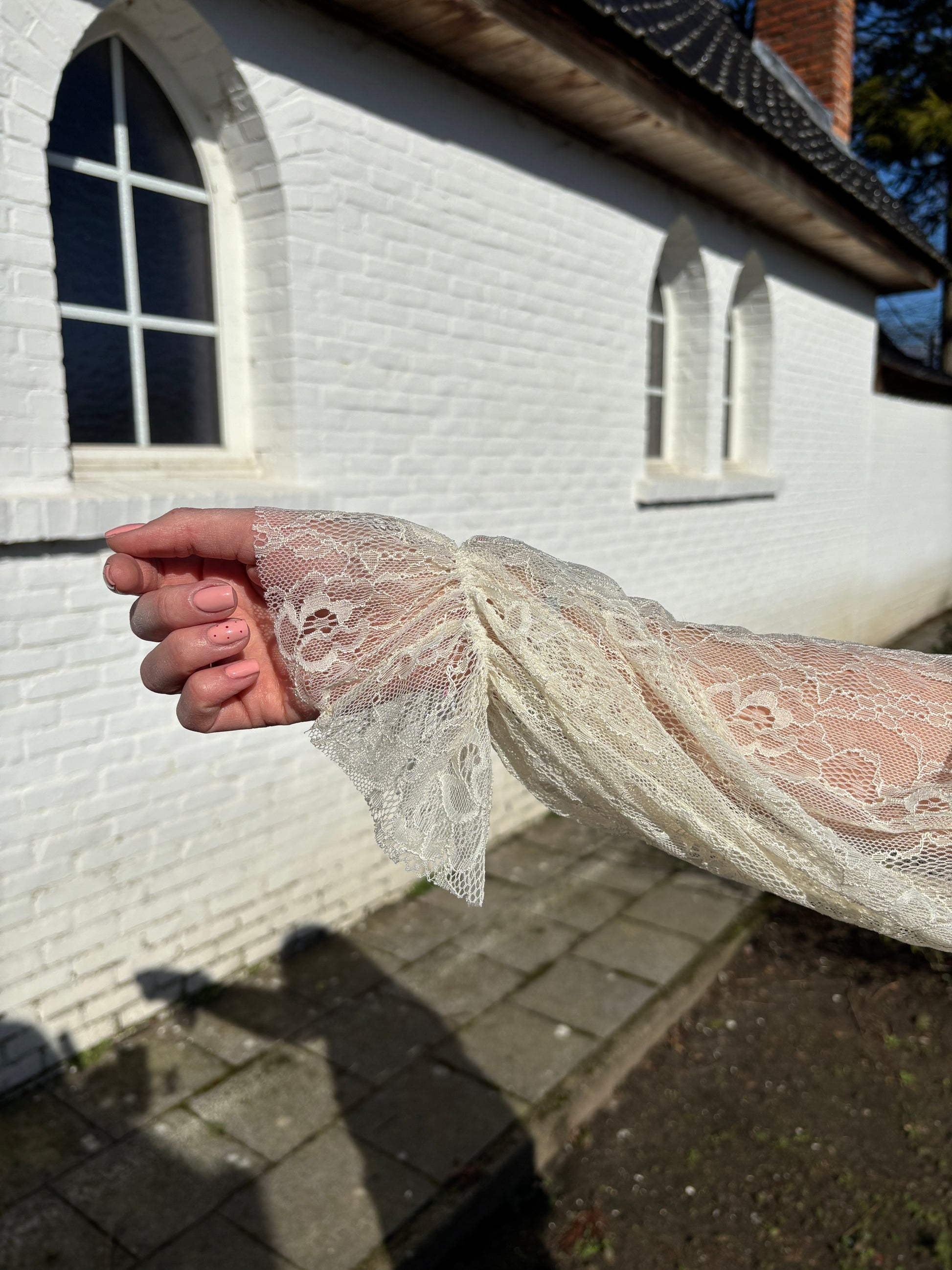 De trui heeft kanten mouwen die eraan vast hangen.